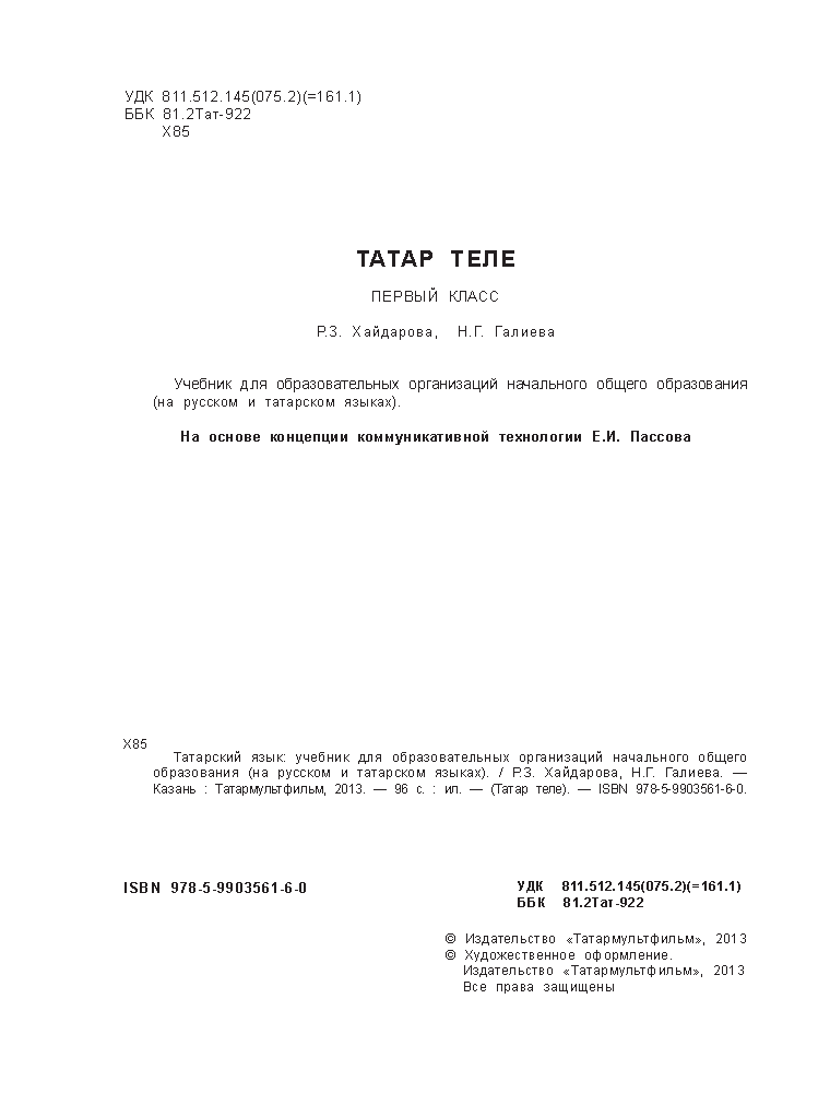 Татарский язык: учебник для образовательных организаций начального общего образования (на русском и татарском языках). / Р.З. Хайдарова, Н.Г. Галиева. — Казань : Татармультфильм, 2013. — 96 с. : ил. — (Татар теле). — ISBN 978-5-9903561-6-0.