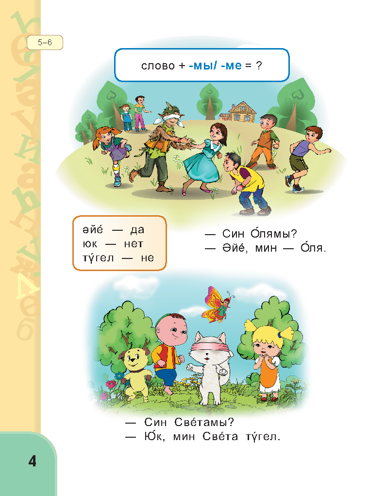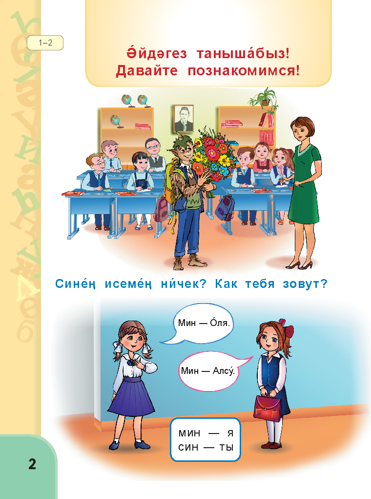 Обучающиеся получают первоначальные навыки коммуникации, знакомятся друг с другом, задают друг другу вопросы: «Бу кем? — Кто это? Бу нәрсә? — Что это? В каком городе ты живешь?», учатся правильно отвечать на эти вопросы. Обучающиеся знакомятся с основными приветствиями, лексемами «деревня, город», названиями континентов и некоторых стран. Обучающиеся учат числа от 1 до 10. В форме диалога дети учатся задавать вопрос «Сколько тебе лет?» и правильно отвечать на него. Знакомятся с буквами и обозначающими их звуками. С помощью рисунков обучающиеся учат новые слова – названия диких животных и формы множественного числа. В ходе знакомства со сказкой «Теремок» закрепляется пройденный материал, оттачиваются навыки ответов на вопросы типа «где живет то или иное животное?».